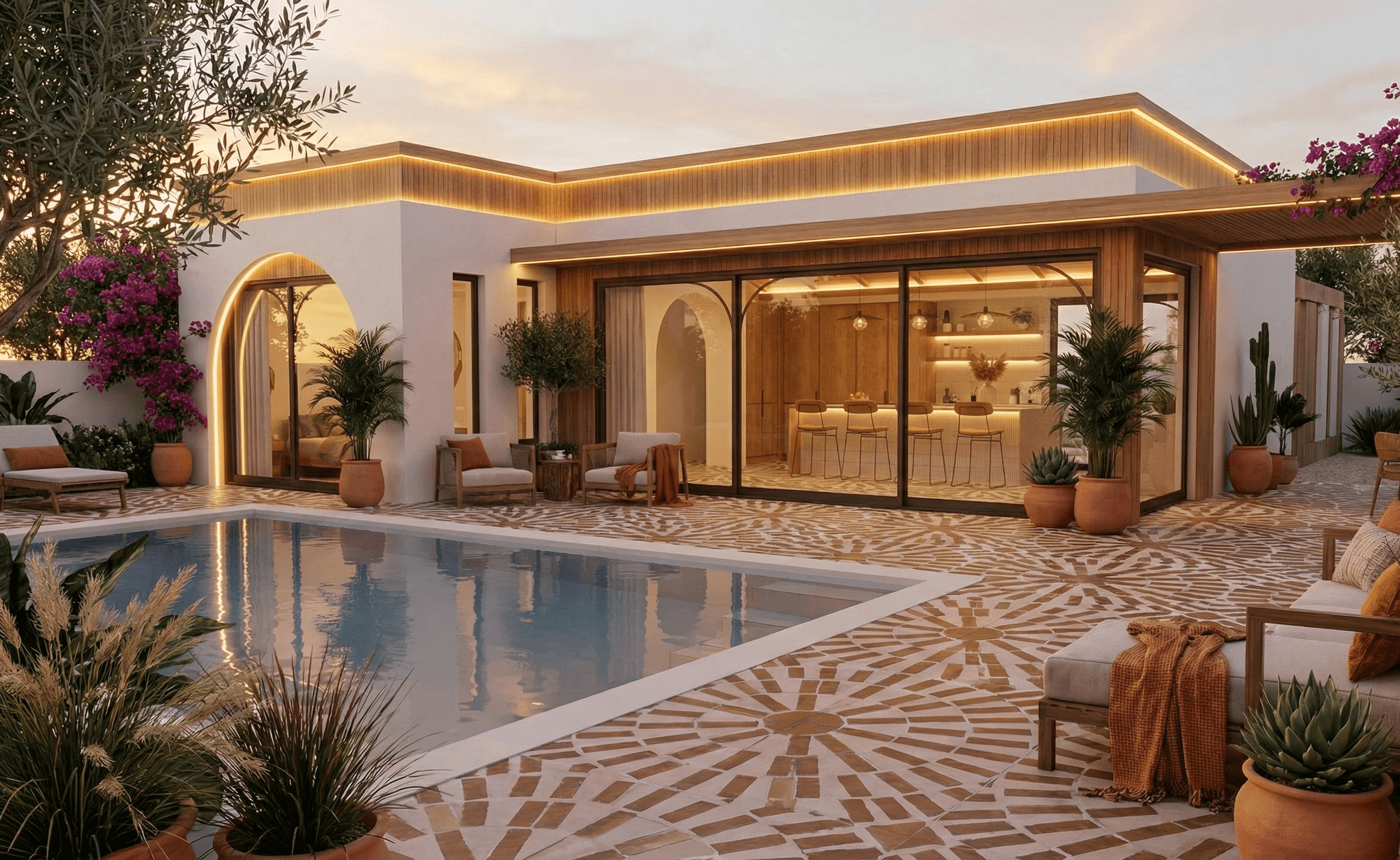 A warm, contemporary family home build, defined by soft neutral tones, natural light, and refined material contrasts.