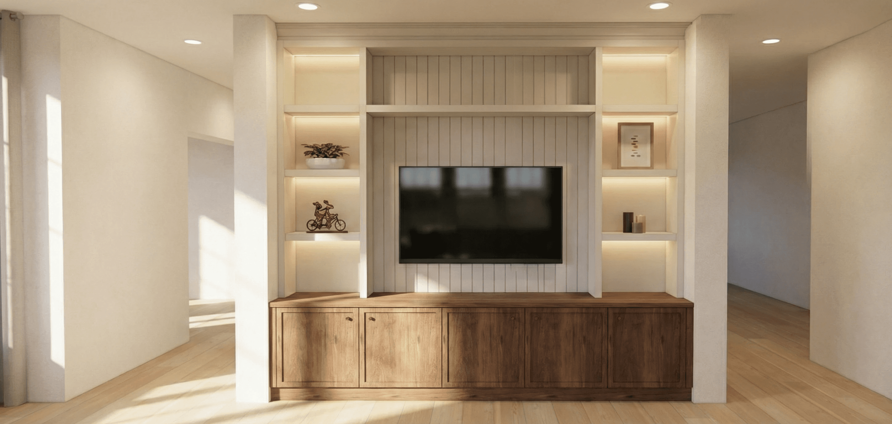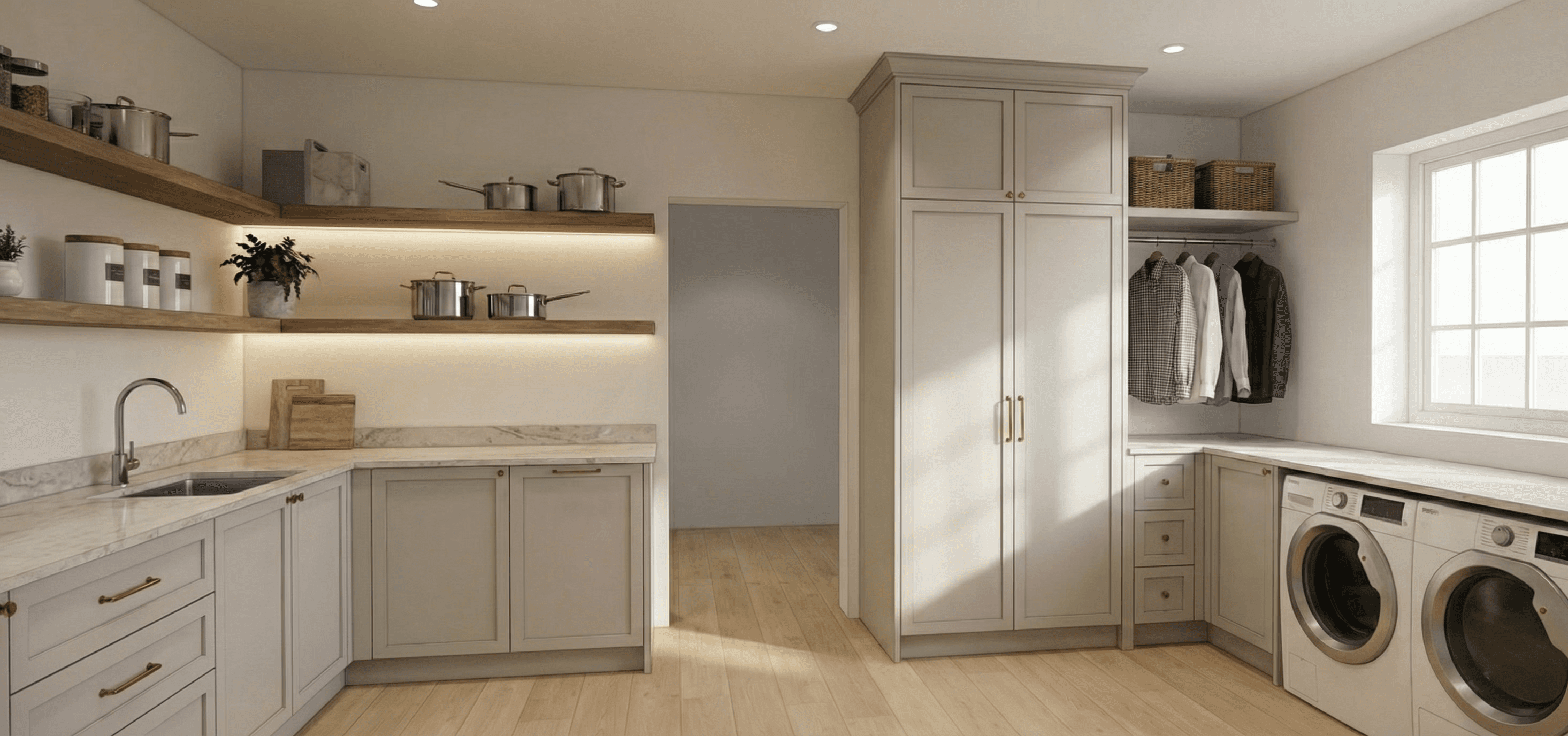 A residential interior that combines traditional joinery with a clear, structured layout throughout the home. Consistent materials, integrated storage, and a restrained colour palette create a cohesive and functional living environment.