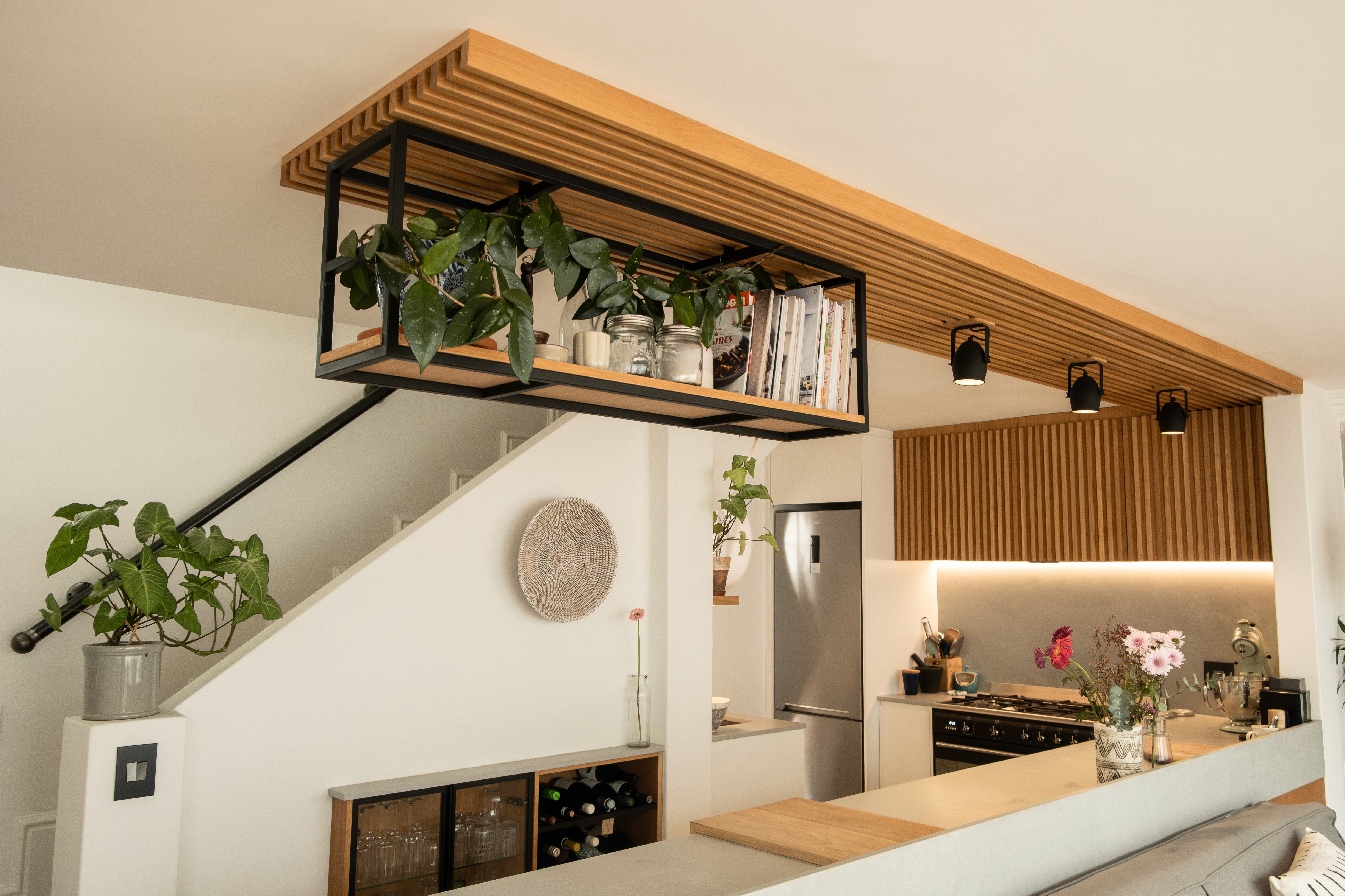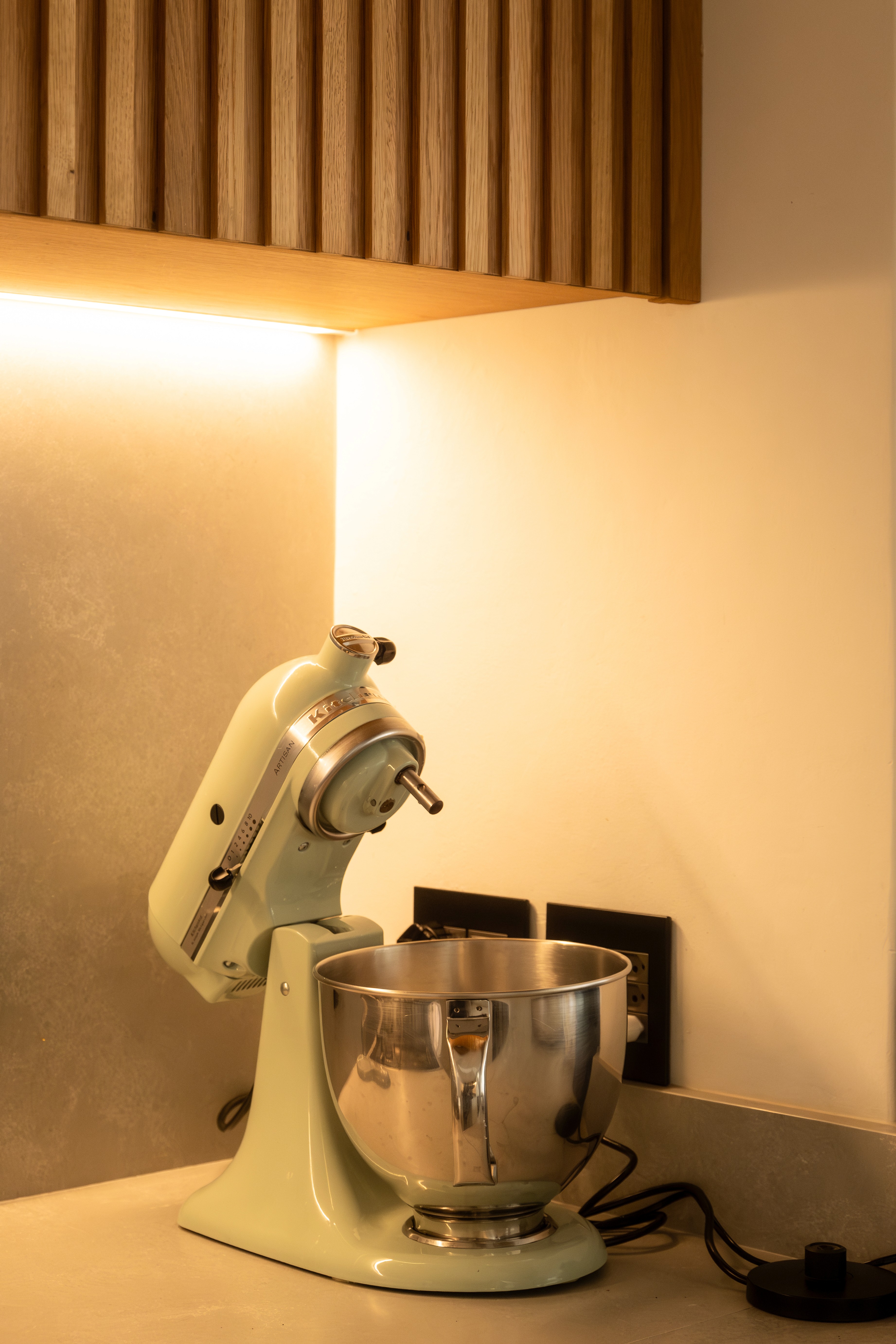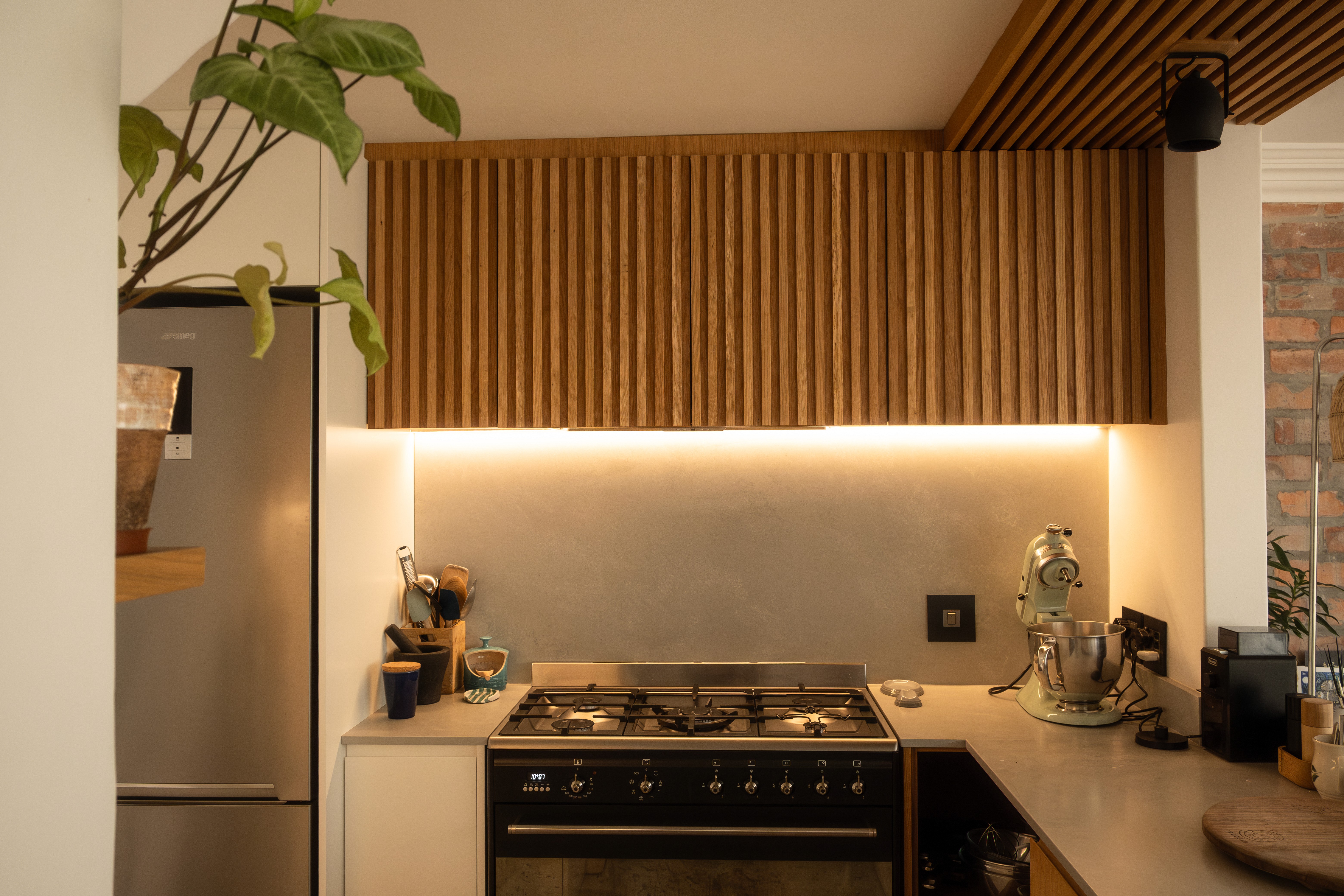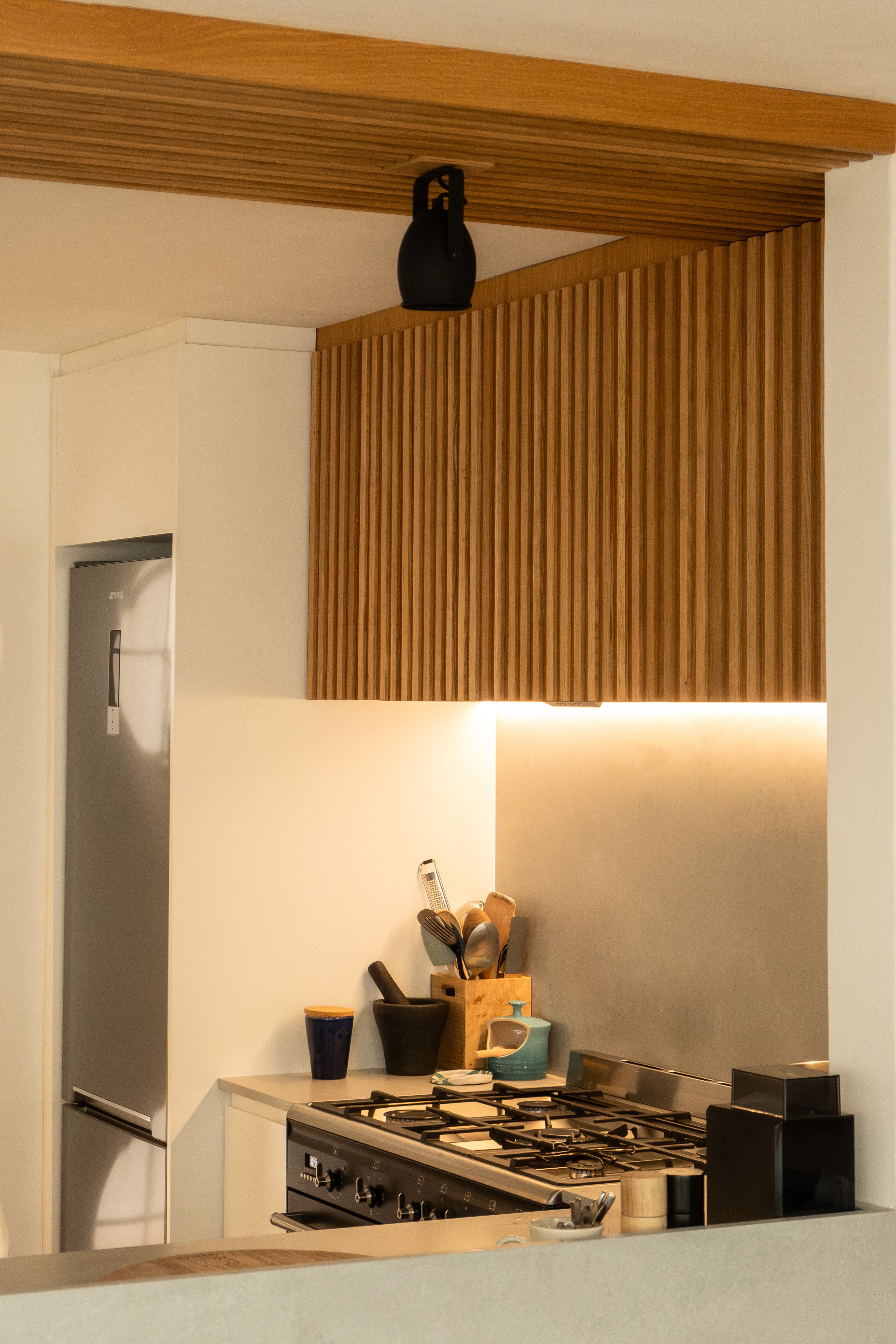 A compact, characterful kitchen renovation featuring warm timber detailing, layered textures, and soft, ambient lighting.