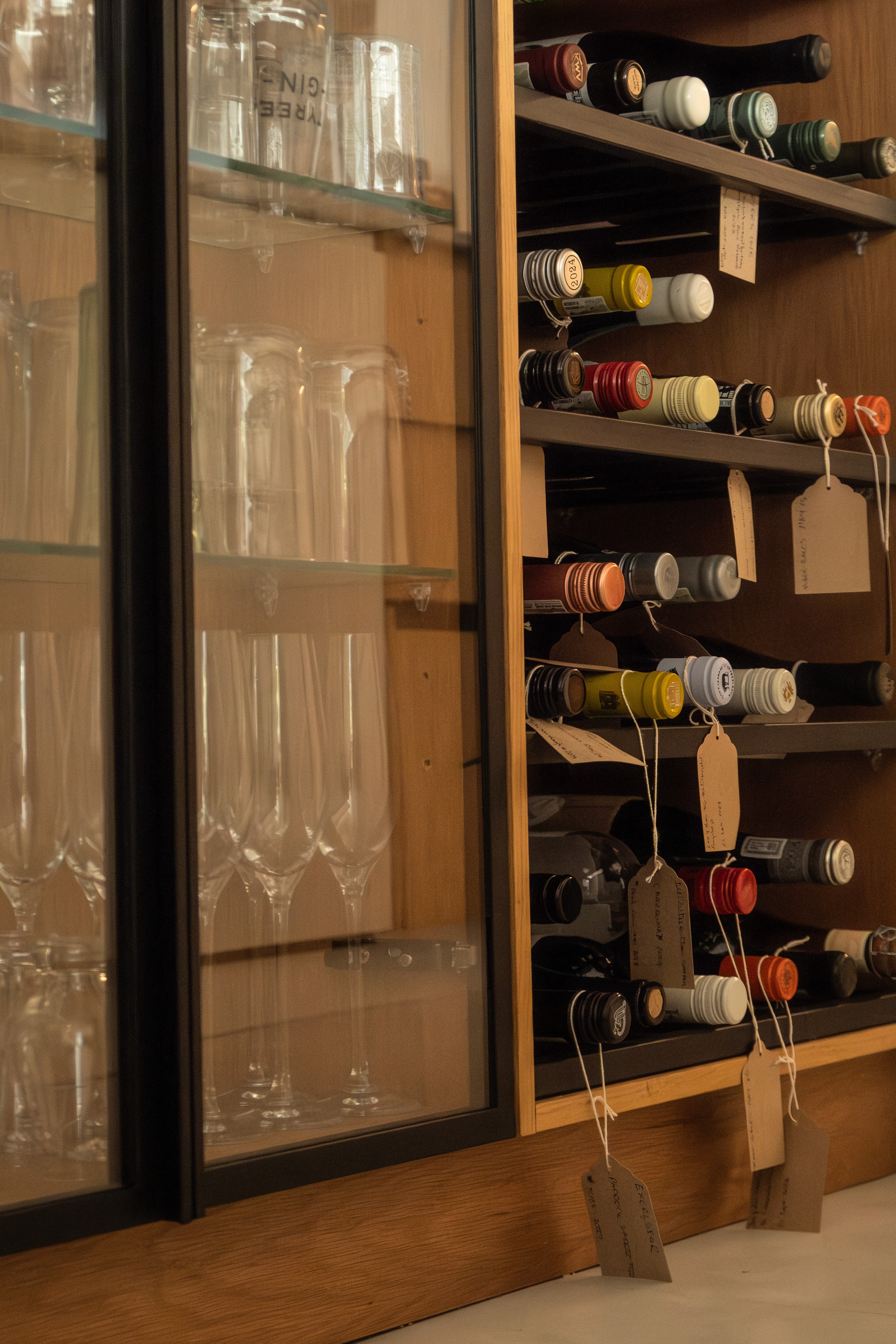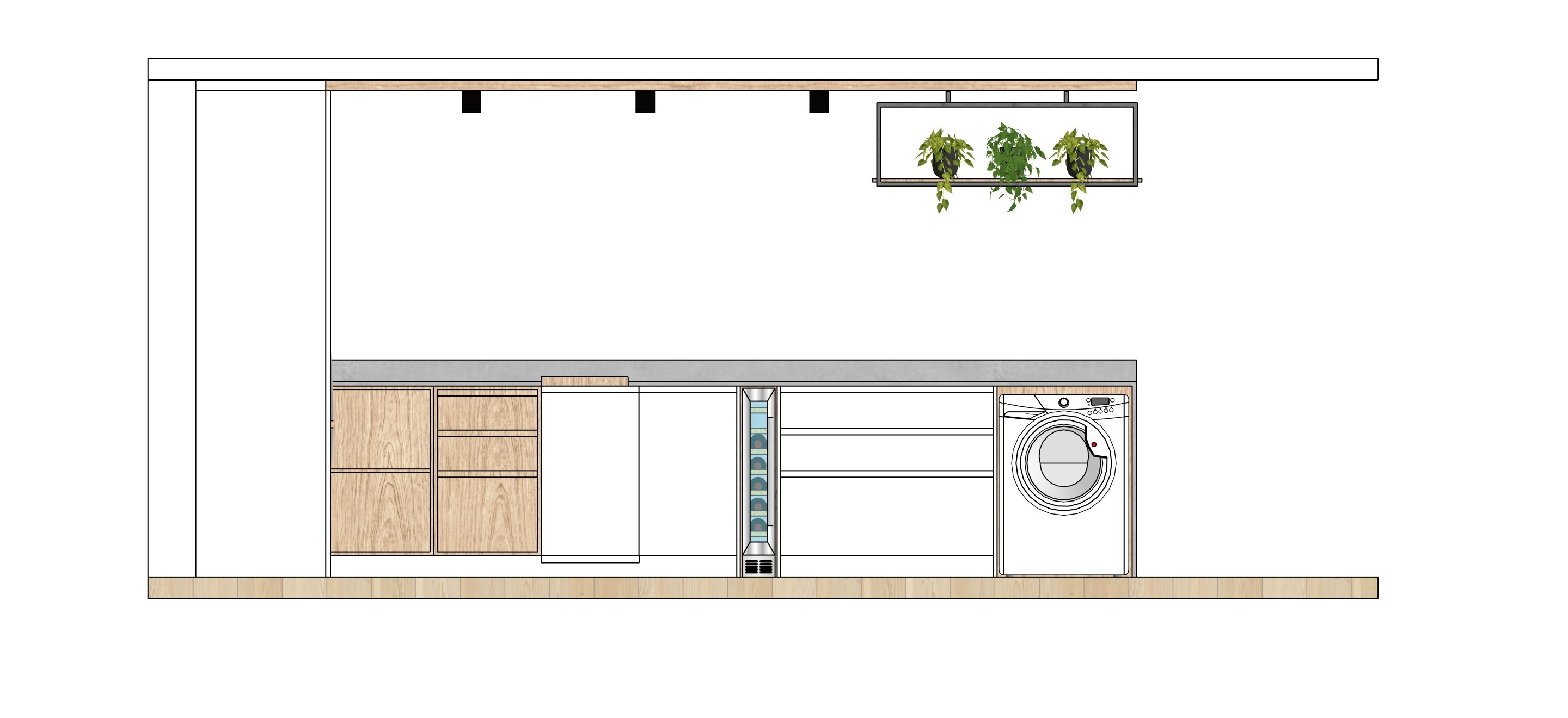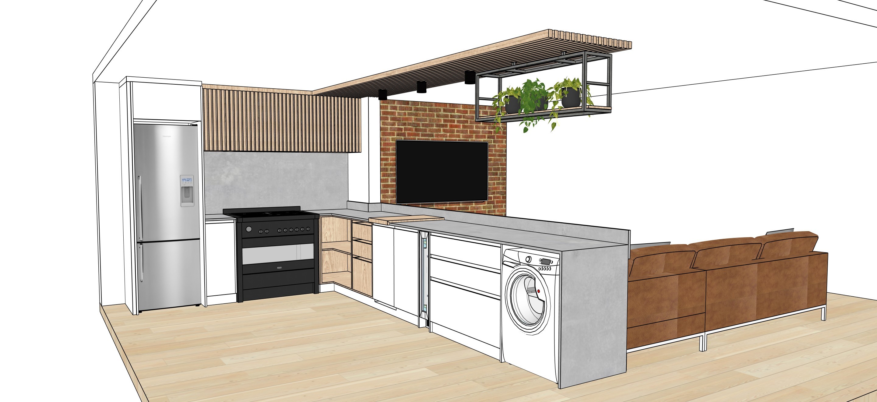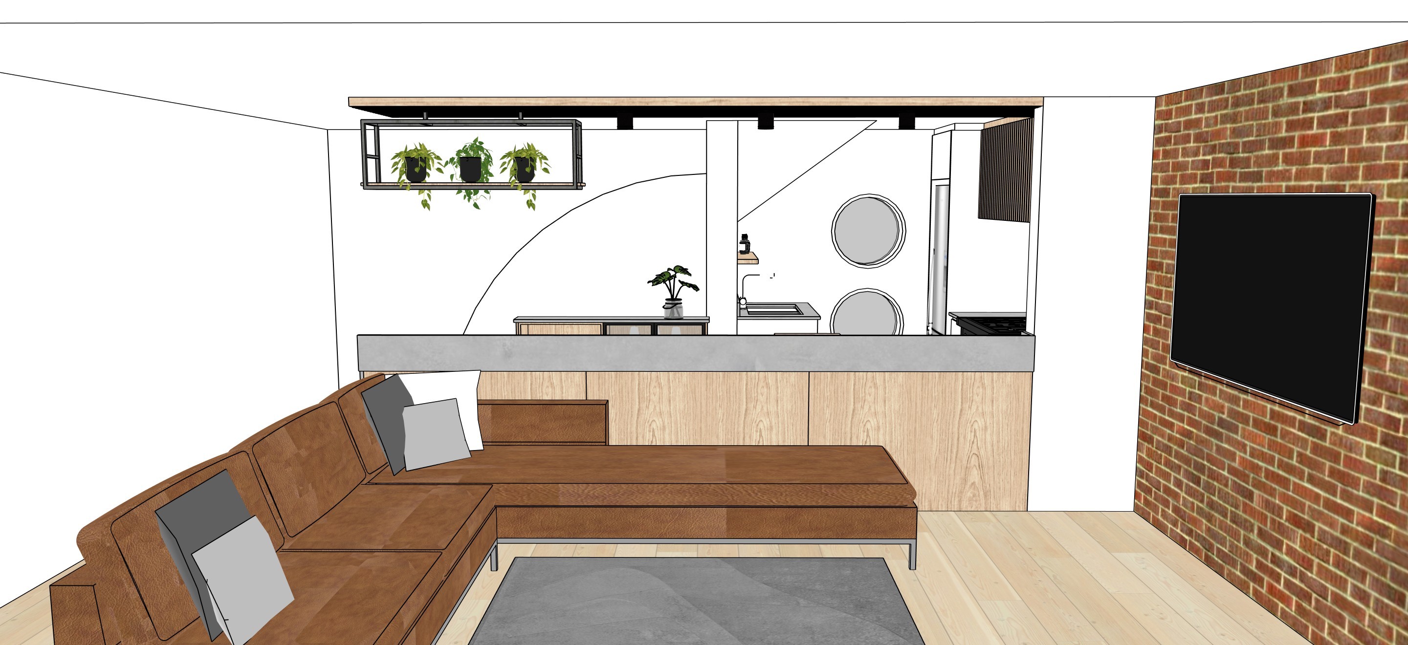 A compact, characterful kitchen renovation featuring warm timber detailing, layered textures, and soft, ambient lighting.
