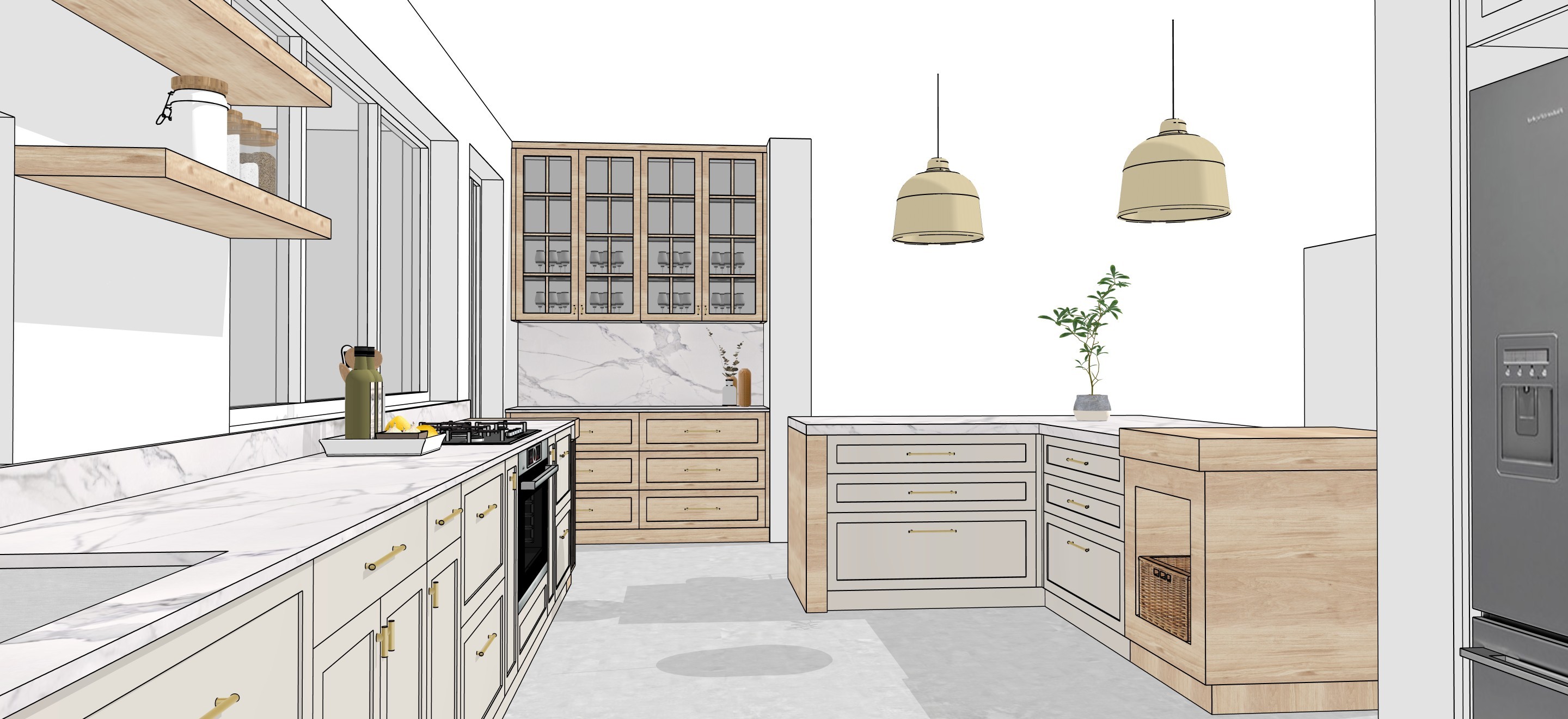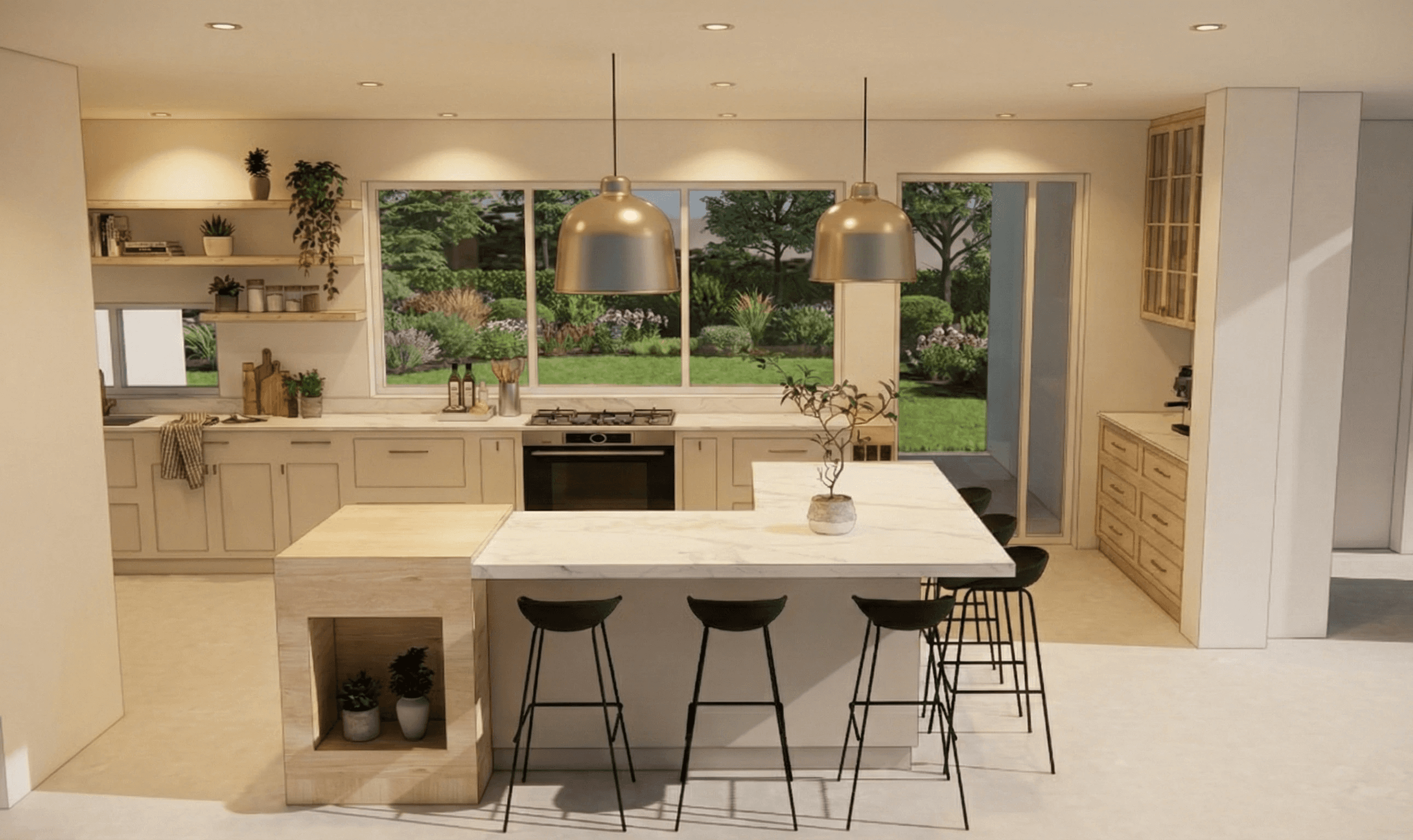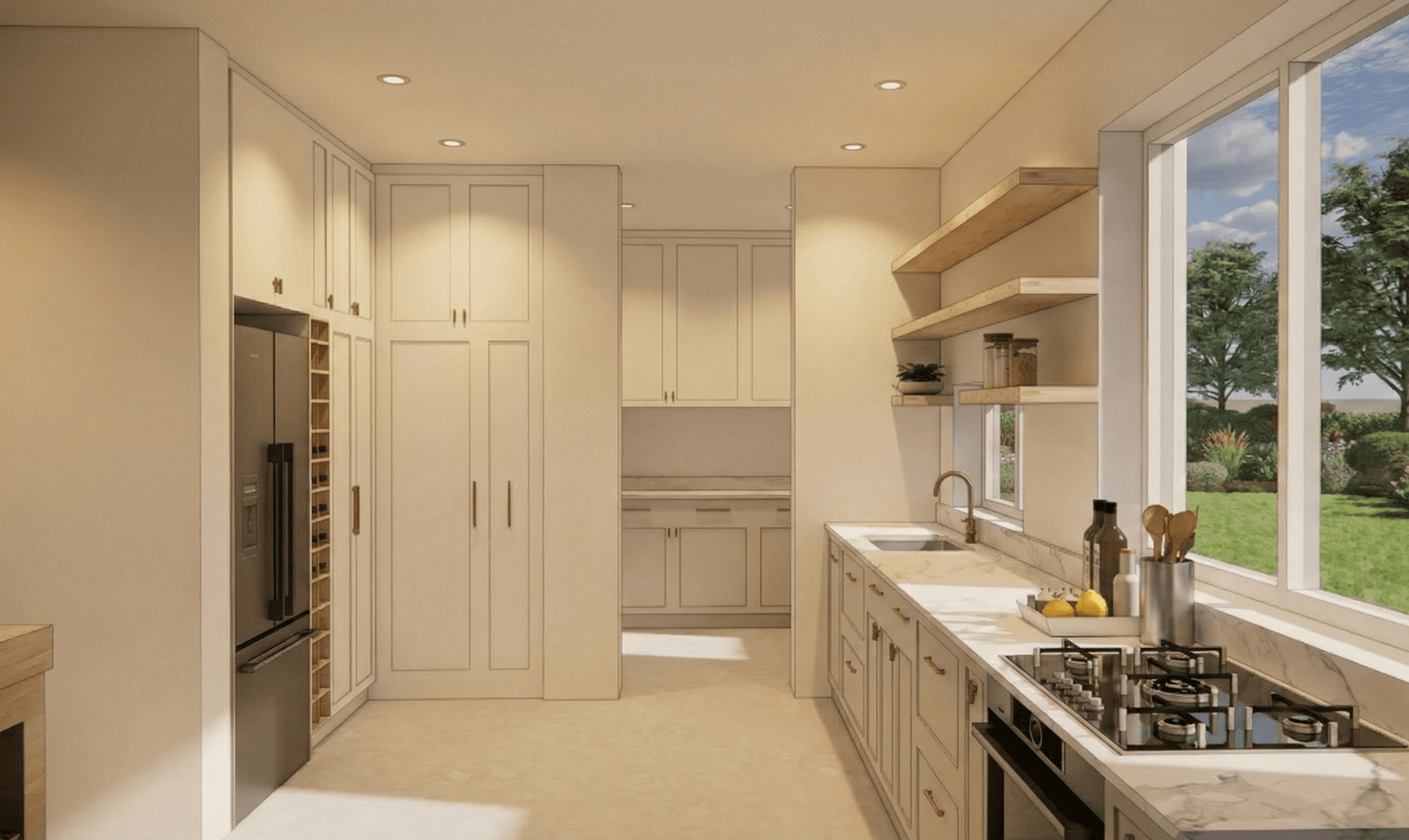 A contemporary kitchen with clean lines, neutral tones, and a mix of classic cabinetry and modern details. Natural light and simple material choices create a functional, balanced space.