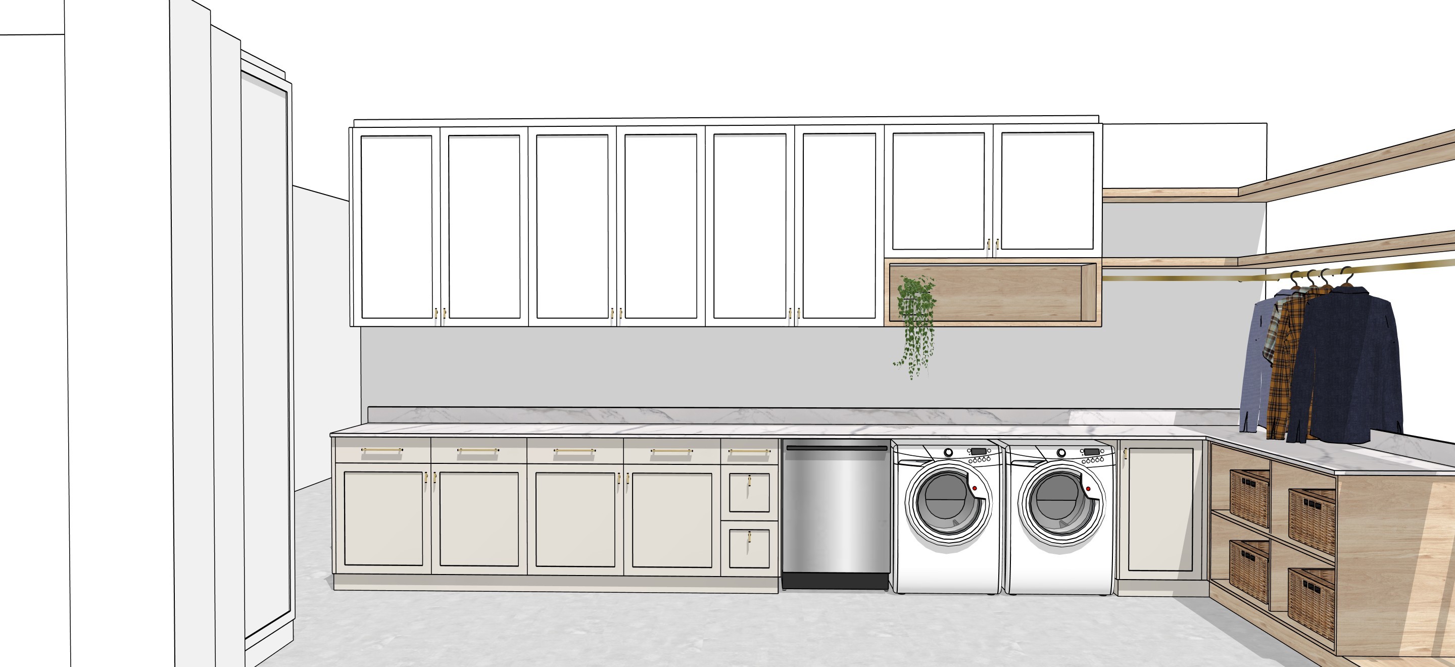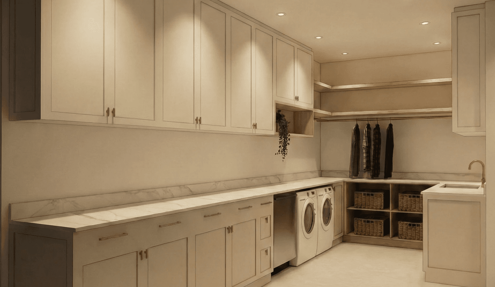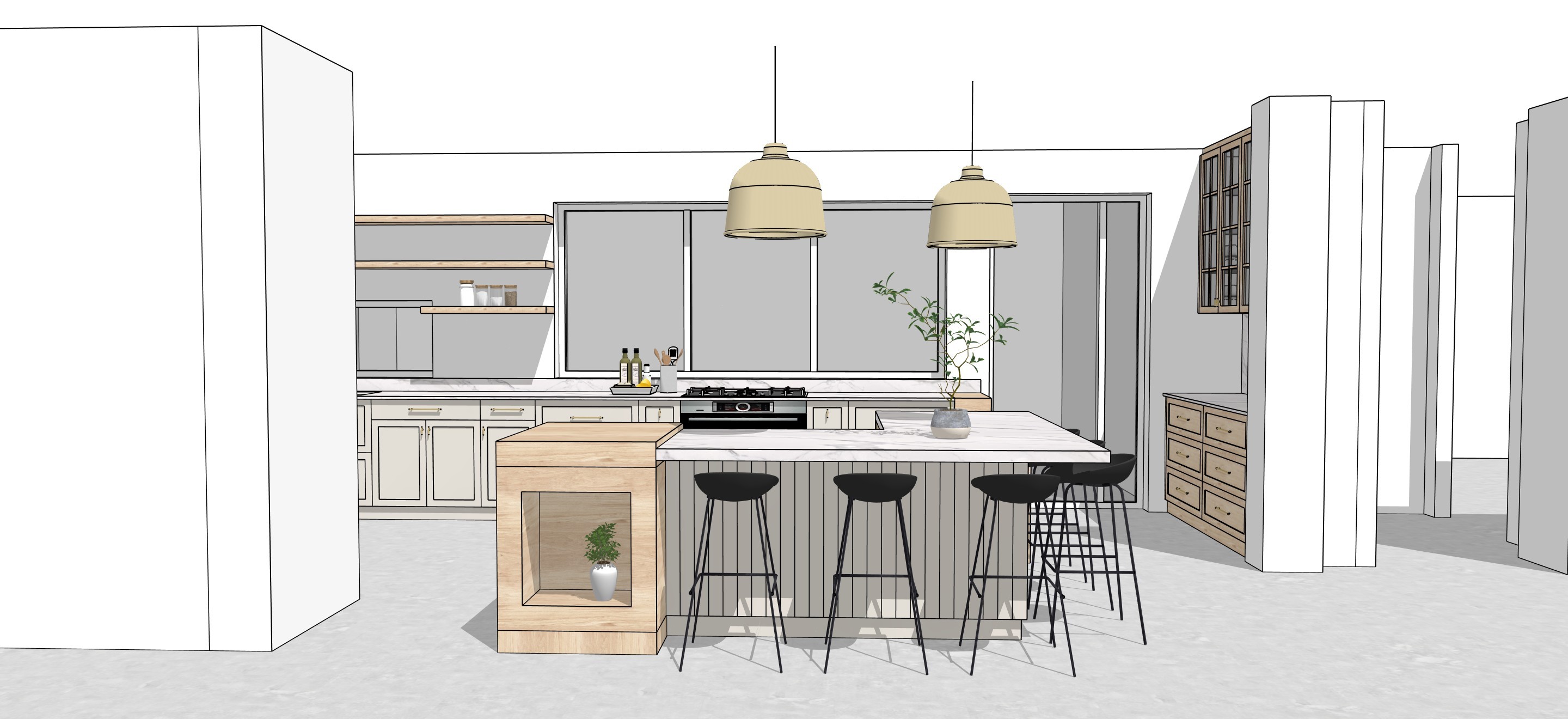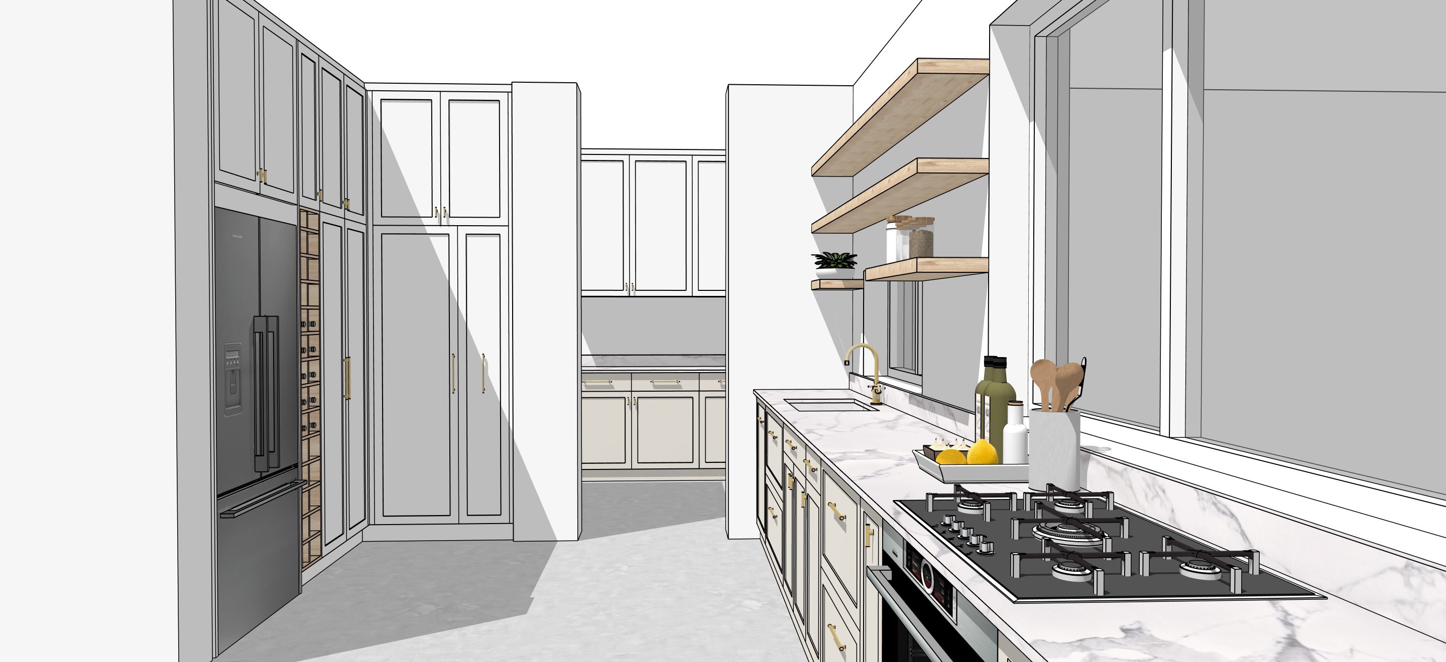 A contemporary kitchen with clean lines, neutral tones, and a mix of classic cabinetry and modern details. Natural light and simple material choices create a functional, balanced space.